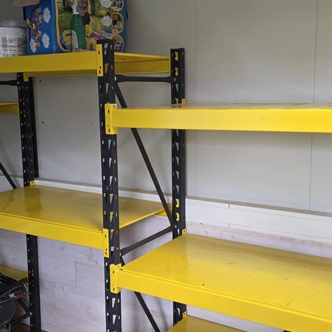 Metallager reolsystem i galvaniseret stål med flere hylder. Reolerne er åbne og egner sig til opbevaring i fx garage, værksted, kælder eller skur. Konstruktionen består af metalstolper med boltesamlinger og metalhylder. Systemet kan typisk justeres i højden ved at flytte hylderne i de forborede huller. Velegnet til opbevaring af kasser, værktøj og andre genstande, hvor der ønskes robust og let rengørlig opbevaring. 3 stk 450 kr