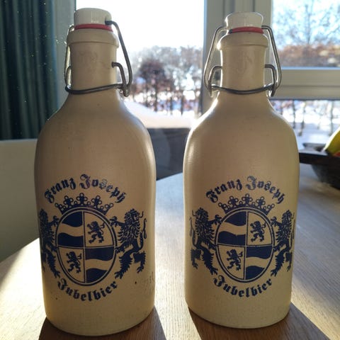 Hollandsk geneverflaske, Hollandsk geneverflaske i keramik med 6 glas og kasse.