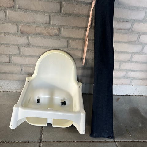 IKEA højstol i hvid plast med aftagelig bakke. Stolen har metalben og integreret sikkerhedssele. Egnet som spise- eller fodringsstol til små børn. Sædet er formstøbt plast, som er let at tørre af. Bakken kan tages af efter behov, så stolen kan bruges både ved bord og med egen spisebakke.