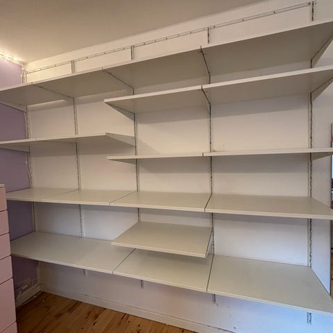 Ikea Boaxel reolsystem i hvid metal. To rækker med 60 cm bredde 40 cm dybde, og en med 80 x 40 cm. Dvs 4 monteringsskinner i 2 meters længde. 2 egetræsmalede hylder på 80 cm og 3 på 60 cm x 40 cm . 3 buksebøjle “hylder” på 60 cm. 2 skohylder i hvid metal på 60 x 40 cm. 3 bøjlestænger på 60 cm og 2 i 80 cm. 13 hyldeknægte til ophængning af hylderne. Skruer og ender til bøjlestænger findes. Perfekt til en herregardarobe til at hænge jakkesæt, skjorter og bukser.