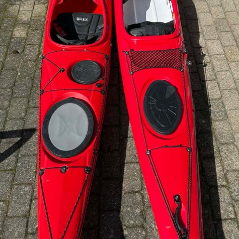 Prijon havkajak i rød farve. Kajakken har lukket cockpit med cockpitovertræk, opbevaringsluger for og bag samt dæksliner og elastikker til fastgørelse af udstyr. Velegnet til ture på sø, fjord og kystvand. Billederne viser desuden en kajakvogn, pagaj og redningsvest, som indgår i handlen.
