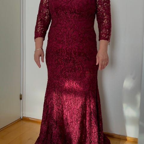 Kjolen er i flot rød velour (polyester) med et langt snit.