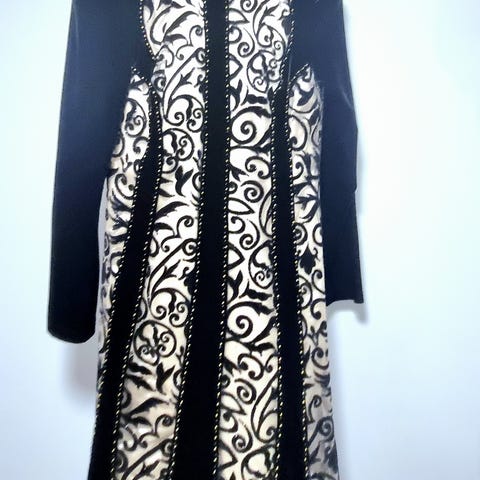 Den har draperinger foran, som giver et smukt og elegant fald i stoffet.