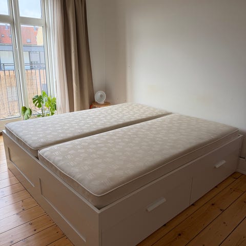 Madrasser medfølger ikke. Almindelig slidtage men fremstår pæn og fuldt funktionel. Afhentes og skilles af køber.