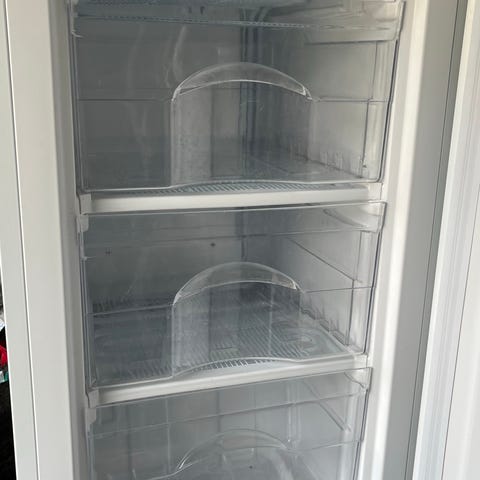 Matsui skabsfryser i hvid. Fryseren har frontlåge og indvendigt fire gennemskuelige skuffer, som giver mulighed for at adskille og organisere frostvarer. Kompakt model, velegnet til mindre køkkener, bryggers eller som ekstra fryseplads. Standard eltilslutning bagpå. Yder- og inderside fremstår i hvid plast/metal med plastskuffer indeni. Misfarvet af solen.