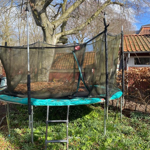 Trampolinen er brugt, men i god stand med masser af fjedring tilbage.