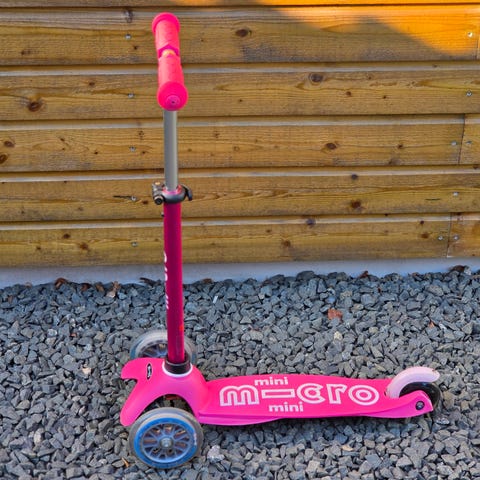Micro løbehjul i hvid. Sammenklappeligt løbehjul med store hjul og justerbar styrhøjde. Egnet til transport og leg på jævne underlag. Passer til både større børn og voksne afhængigt af højde og vægtbegrænsning fra producenten.