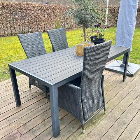 Havebord og stole i kunstflet i gråbrun farve. Sættet består af et rektangulært bord med planker på bordpladen og flettet understel samt matchende stole med armlæn. Materialet fremstår som vejrbestandig kunstflet, egnet til udendørs brug på terrasse eller altan. De to loungestole i samme flettede materiale har en kubisk form med brede armlæn og lav siddehøjde, velegnet som afslapningsmøbler i haven eller på altanen.