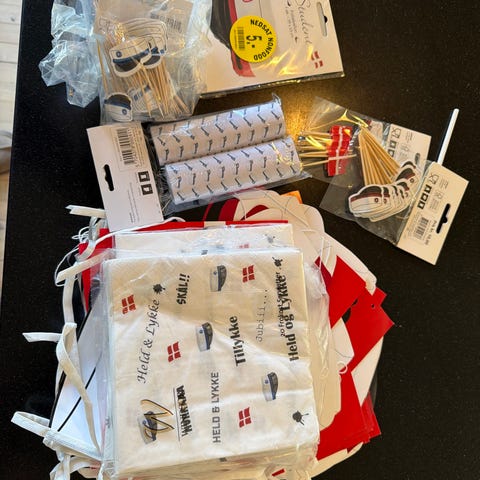 Servietter, bordpynt og studenter huer på tandstik - pris pr. pakke 10 kroner
