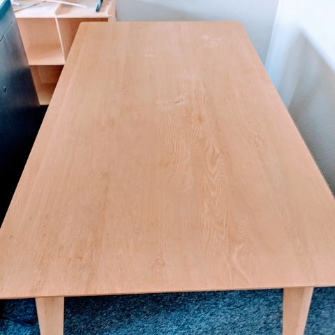 Spisebord KALBY 90x130/220 i lys eg. Brugt i 3 år, men stort set som nyt. En enkelt lille ridse fra en kniv (kan kun anes i det rette lys). Benene kan let skrues af, så det ikke fylder meget ved transport.