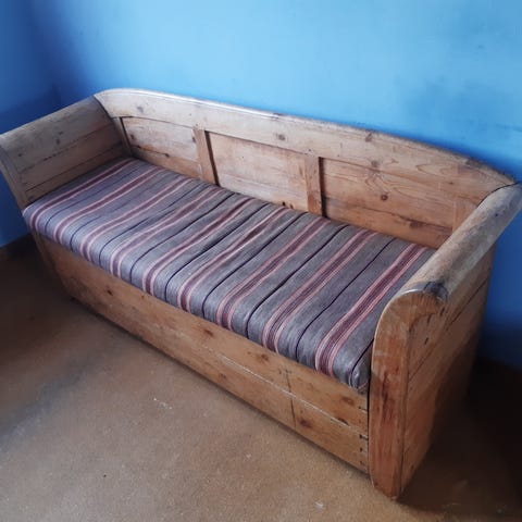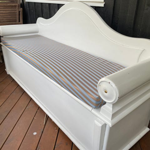 Rigtig fin hvidmalet slagbænk betrukket med praktisk beige-farvet “læder-look”. Kan nemt monteres med andet stof efter eget ønske. Enkelte steder er malingen skrabet af.