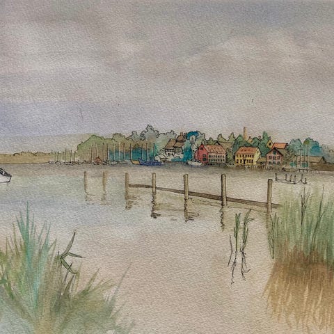 Akvarel, Ellen Byström, b: 68 h: 52, Akvarel indrammet bag glas i guldramme, signeret “ Ellen Byström, Christiansø, 1947”, fin stand.