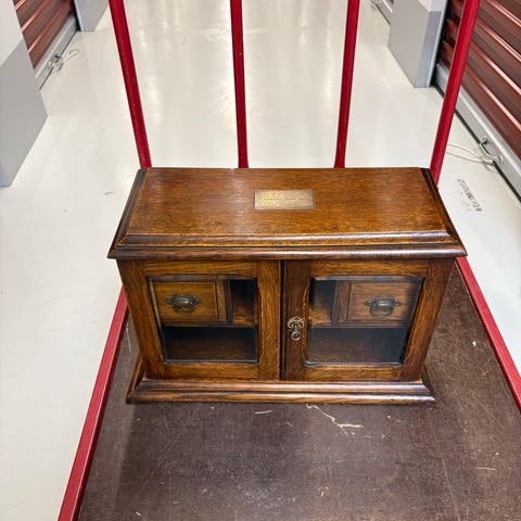 Tobaksskab fra 1807 i grønlige farver. Måler h: 74cm, b: 62cm d: 35cm.