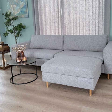 Flotteste lys grå chaiselong sofa i blødt og slidstærkt kvalitets stof. Betræk på puder og hynder kan aftages og vaskes i maskine.