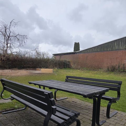 Havebord med integrerede bænke i træ og metalstel. Kraftigt og god kvalitet. Velegnet som udendørs bord-/bænkesæt til terrasse, have eller gårdmiljø.