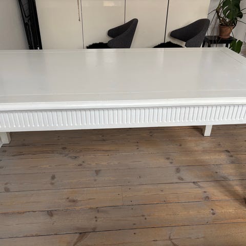 Bordplade har brugsspor og et hul som er forsøgt lukket - vi har købt bordet brugt i samme stand som nu men har fortrudt at sætte det i stand.