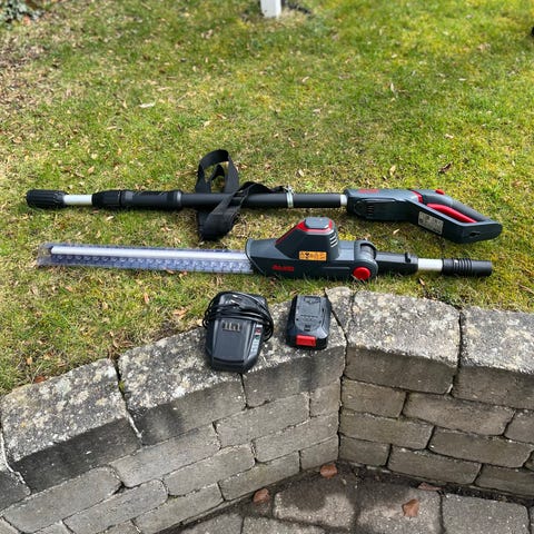 Einhell 18V teleskop hækkeklipper i grøn. Batteridrevet model til brug med 18V Power X-Change batterisystem (batteri medfølger ikke). Teleskopskaft med justerbar længde fra ca. 2,1 til 2,6 meter, egnet til klipning af hække og buske i højden. Oplyst kapacitet op til ca. 200 m² pr. 2,5 Ah batteri. Udstyret med anti-blokeringssystem for mere jævn klipning. Vægt og øvrige tekniske data fremgår af emballagen som 1–1,5 Ah og 3–4 kg (afhængigt af batteri). Velegnet til almindeligt havearbejde omkring hus og have, hvor der ønskes batteridrift og teleskopfunktion.