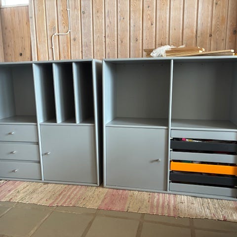 4 * Montana opbevaringsmoduler med låger og skuffer, mål h70*l70*d38, altså 38 cm i dybden. Skuffer og låger virker upåklageligt