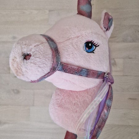 Kæphest enhjørning i blød plys - lyserød og lilla.