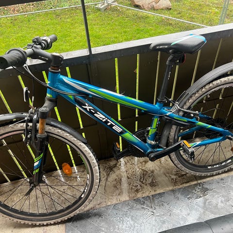Skyride børnecykel med 24" hjul i lyseblå farve. Cyklen har lav indstigning, bagagebærer og skærme for og bag. Udstyret med støtteben, sadel og håndtag i lys farve samt håndbremser. Velegnet som hverdagscykel til børn.