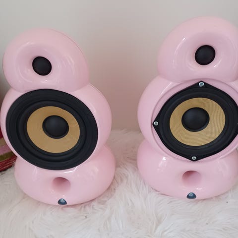 Scandyna Podspeakers højttalere i hvidt kabinet med karakteristisk organisk form og tre slanke metalben som standere. Højttalerne har frontmonteret bas/mellemtone-enhed med lys membran og sort kant samt integreret basrefleksport i fronten. Bagsiden er glat med sort bagstykke. Velegnet som kompakte stereohøjttalere til stue eller kontor, hvor der ønskes et særpræget design kombineret med hi-fi-lyd. Scandyna højtalerne står som nye, det kan jeg ikke skrive i under stand fordi der er et lille mærke på den ene højtaler se foto 6. De spiller godt.