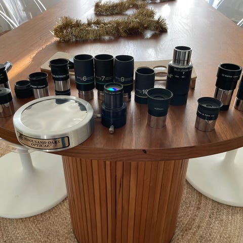 Teleskop, Borg, ED76, fin stand, suverænt apokromatisk teleskop, der giver et billede, der matcher selv de dyreste naturteleskoper, bare meget mere vidvinklet, en stor fordel. Fantastisk skarphed og kontrast. Teleskopet kommer med et retvendt 2" amiciprisme og et vidvinkelokular med hele 82 grader AFOV, der giver 32X forstørrelse. Teleskopet er også meget velegnet til sommerfugle og insekter. Der er så tusindvis af okularer i alle prisklasser at vælge imellem, f.eks. kan man udstyre det med en Baader Hyperion 8-24mm zoom til 2200kr, der vil give forstørrelser fra 21X til 62X, hvis man foretrækker en zoomlinse. Det er beklædt med camouflagefolie som let kan pilles af, hvis man foretrækker et hvidt look som på billedet. Det er monteret med manfrottokomapatibel skinne, men kan selvfølgelig også monteres med andre stativadaptere.