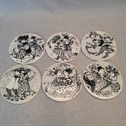 Platte med sort hvidt motiv. Rund platte i porcelæn med detaljeret grafisk illustration på forsiden. Bagsiden har tryk med tekst og årstal 1978. Velegnet som dekoration eller til brug som serveringstallerken efter behov.
