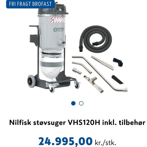 Nilfisk Maxxi II industristøvsuger . Støvsugeren er en våd-/tørsuger egnet til brug i værksted, lager eller andre erhvervsmiljøer. Enheden har robust kabinet, store hjul og håndtag for nem transport. Der medfølger sugeslange monteret på maskinen.
