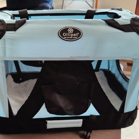 Ollipet hundetaske i grå tekstil med justerbar skulderrem. Tasken har lynlåslomme på ydersiden samt indvendig rem med karabinhage til fastgørelse af hundens sele eller halsbånd. Egnet til transport af mindre hunde eller andre små kæledyr. Indersiden er blød for øget komfort under transport.
