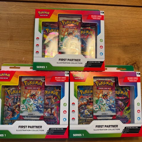 Pokémon First Partner Illustration Collection samlekort sæt. Sættet indeholder Pokémon Trading Card Game boosterpakker og et illustreret First Partner kort fra Series 1. Velegnet til samlere og til brug i Pokémon Trading Card Game.