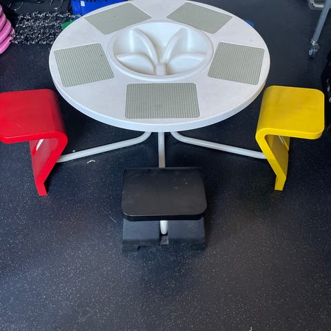 Sjældent LEGO aktivitetsbord med to stole. Bordpladen kan vendes om, så det kan bruges som et almindeligt bord. Bordpladen har en indbygget byggeplade, som passer til almindelig LEGO. Der er to beholdere til Legoklodser, blyanter mm, som sidder fast på bordet. Bordet er 50 cm højt, 70 x 70 bredt, stolene har en siddehøjde på 30 cm. Bordpladen har fået slag i hjørnerne (se billeder), da vi tabte bordpladen engang ned af trapperne. men ellers er alt fuldt funktionelt. Vi købte sættet på auktion for 10 år siden. Vores børn har leget med det i mange år, men er for store nu.
