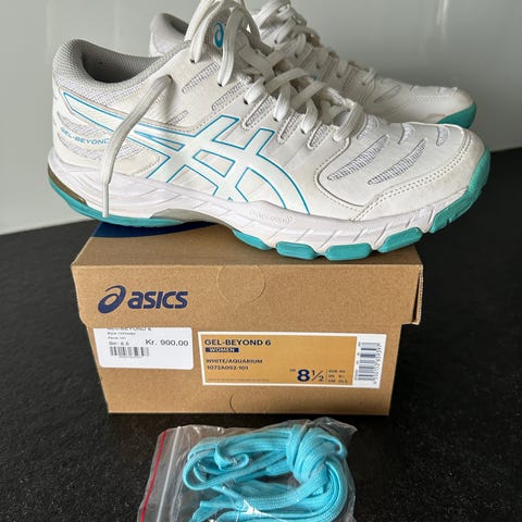 Asics Gel indendørssko i størrelse 45. Skoene er sorte med hvide detaljer og har en ydersål i gummi med lysebrun farve, egnet til indendørs brug. Overdelen er lavet af syntetisk læder og syntetiske fibre. Modellen har Asics Gel-dæmpning i sålen for stødabsorbering. Snørelukning og polstret hælkappe giver støtte omkring foden. Velegnet som indendørssko til forskellige sportsaktiviteter.