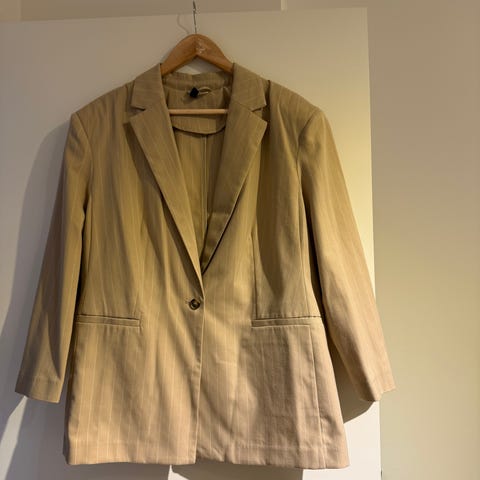 H&M blazer til damer i størrelse 38. Blazeren er fremstillet i linned og er blå. Den har klassisk revers, enkel knaplukning foran og ærmer med knapdetaljer. Indersiden har lyst, stribet foer. Velegnet som let jakke til hverdag eller arbejde.