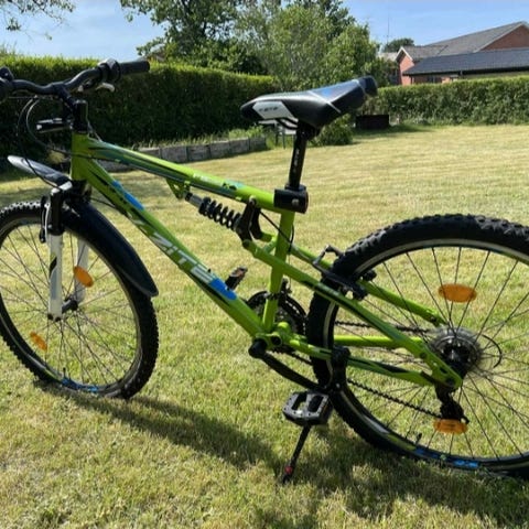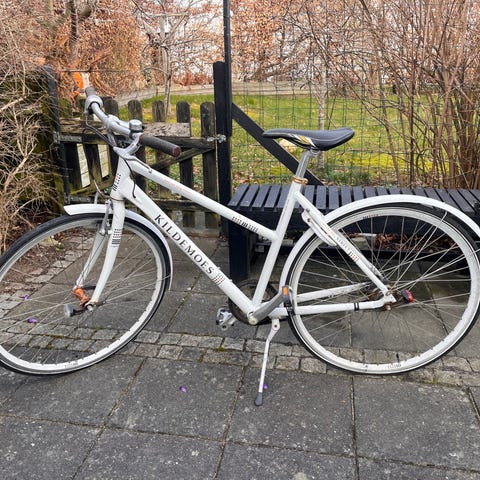 Kildemoes cykel til unisex med stelstørrelse L og 26" hjul. Cyklen har opret kørestilling, kurv foran, skærme og støtteben. Velegnet til daglig transport og bykørsel. Farven fremstår som neutral/metallic tone baseret på billederne.