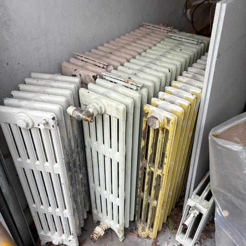 6 stk gamle i støbejern og 1 stk. nyere radiatorer. De virkede alle og var tætte da de blev afmonteret.