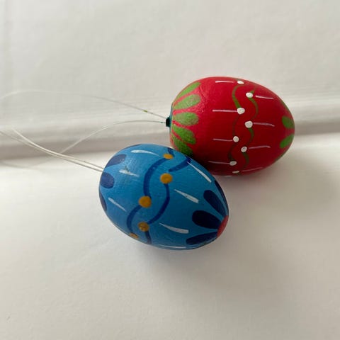 Dekorative æg i hvid farve. Æggene fremstår glatte og ensartede og kan anvendes som pynt, eksempelvis i skåle, på fade eller i andre dekorationer. Velegnet til brug i hjemmet eller til sæsonpynt som påskeudsmykning.