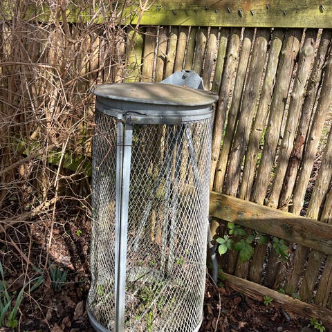 Udendørs affaldskurv i metal med trådnet og rundt låg.