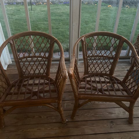 4 hvide flettede kurvestole der har stået ude under halvtag er til salg. De er 2 år gamle. Enkelte steder er lidt maling skrabet af.