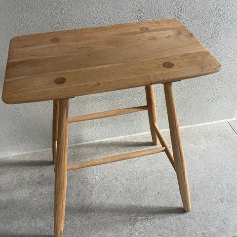 Taburet af fyrretræsfiner og granitgrå linoleum. Den kan f.eks. bruges som skammel, sofabord, natbord eller sidebord.
