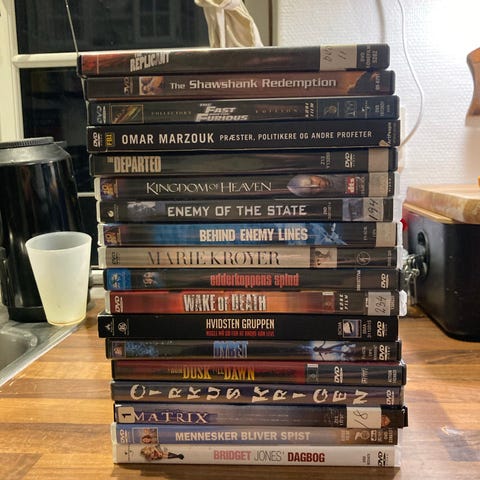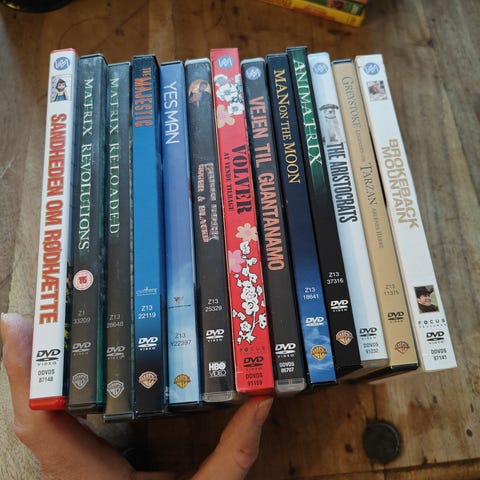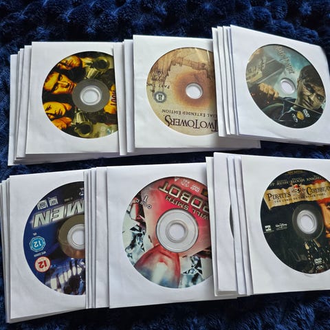 Diske i hvide covers er DVD, og de blå er Blu-ray.