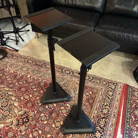 IsoAcoustics højttalerstativer i sort plast. Designet til placering af kompakte højttalere eller studiomonitorer. mål er ca. 15 cm i bredden, 19 cm i dybden og 8 cm i højden. Stativerne har fire fødder med integreret isolering, der reducerer vibrationer mellem højttaler og underlag. Velegnet til brug på reol, bord eller anden plan overflade, hvor der ønskes fast og stabil placering af højttalere.