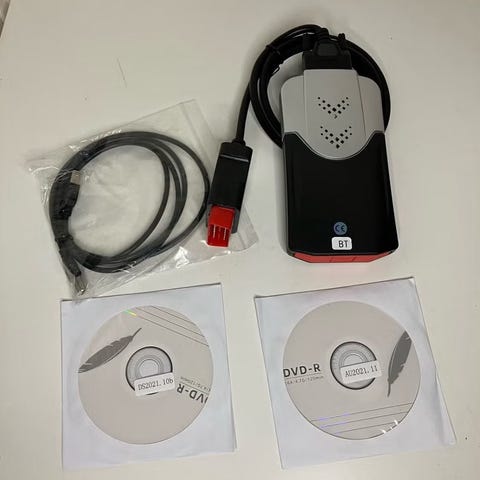 Autodiagnose OBD bil diagnoseværktøj med kabel og software. Sættet består af en OBD diagnoseenhed med fastmonteret kabel og OBD-stik, et separat USB- eller tilslutningskabel samt to dvd’er med software. Enheden bruges til fejllæsning og diagnosticering af biler via OBD-stikket. Farve primært sort med røde og grå detaljer.