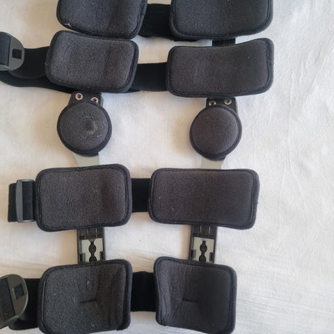 Bauerfeind knæskinne I metal og stof. Den er meget let og nem at tage på og af. Har været brugt i forbindelse med korsbånds og ledbåndsskade. Til højre knæ str 2 (omkreds 10 cm over knæet på 41-45 cm og 10 cm under knæet på 31-35 cm). Der følger skiver med, så skinnen kan låses I bestemte grader. Disse er aldrig brugt. Skinnen er brugt i 3 uger.