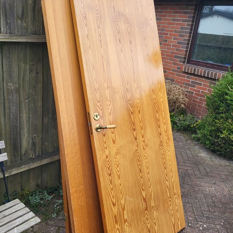 Indvendig dør i træ med glat overflade og monteret dørhåndtag. Døren fremstår som standard indvendig dør, egnet til brug mellem rum i bolig eller lignende. Farven er lys til medium trænuance. Velegnet til udskiftning eller renoveringsprojekter, hvor der ønskes en enkel, glat dør i trælook. Den måler m21x9