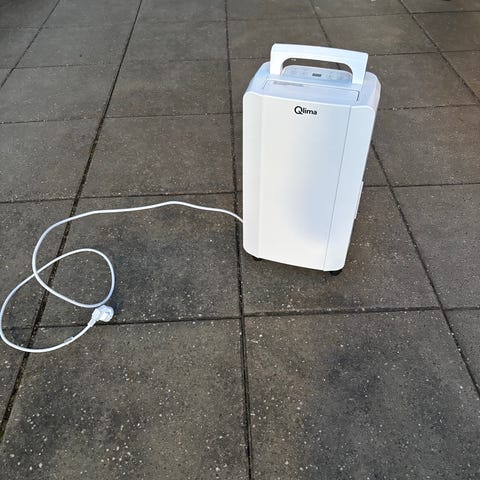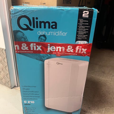 Qlima D210 affugter med en effekt på 280 W. Enheden er designet til at reducere luftfugtighed i rum og er udstyret med hjul for nem transport. Farven er hvid, og den har en kompakt, rektangulær form.