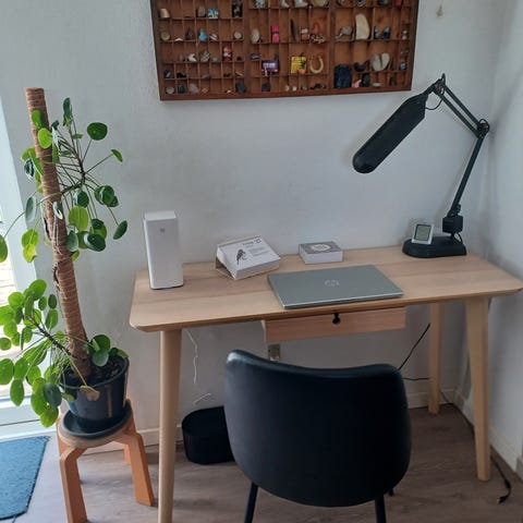 Fint lille skrivebord i asketræsfiner fra IKEA.