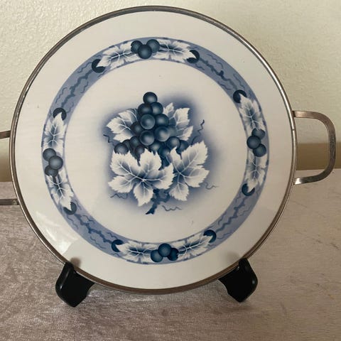 Smuk gammel fransk faience bakke med med motiv af vindruer. Bakken har en metal kant. Bakken er fra første halvdel af 1900 tallet