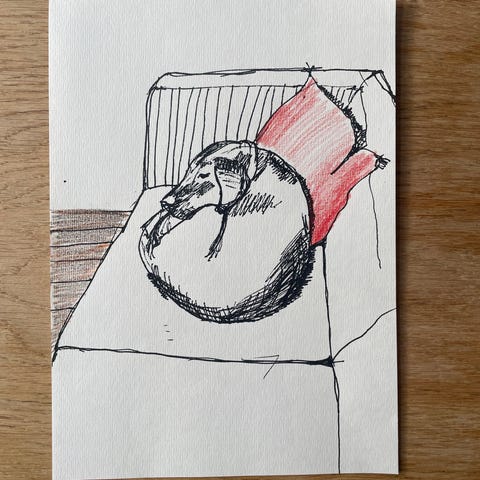 Tegning hund på sofa i blå blyant og blæk