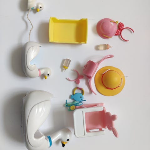 Kattemor med baby, vugge, har og sutteflaske sælges. Meget fin stand. Babyen har en lille prik på panden som eneste brugsspor