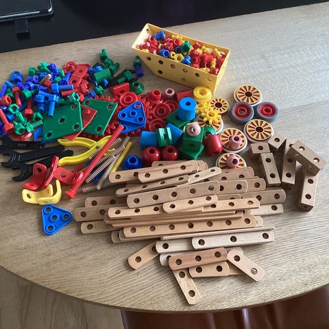 Trælegetøj fra 1970erne med skruer og møtriker
